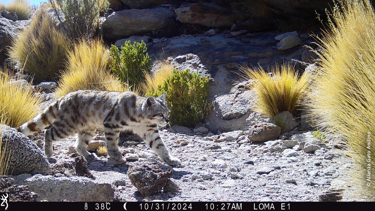 Gato de pajonal registrado por una cámara trampa en Loma Blanca, Argentina. Este tipo de monitoreo, centrado en el gato andino, también aporta información valiosa sobre otras especies presentes en el ecosistema. © AGA