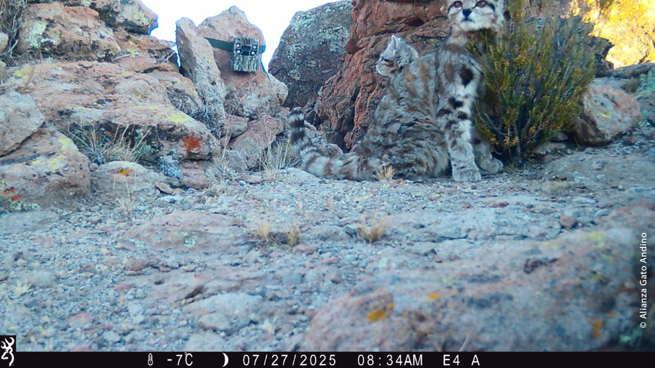 Madre y cachorro de gato andino fotografiados en Loma Blanca, Argentina, junto a una de las cámaras instaladas en un punto de monitoreo con dos cámaras enfrentadas. Este diseño ayuda a mejorar la identificación individual y aporta información valiosa para el monitoreo poblacional. © AGA
