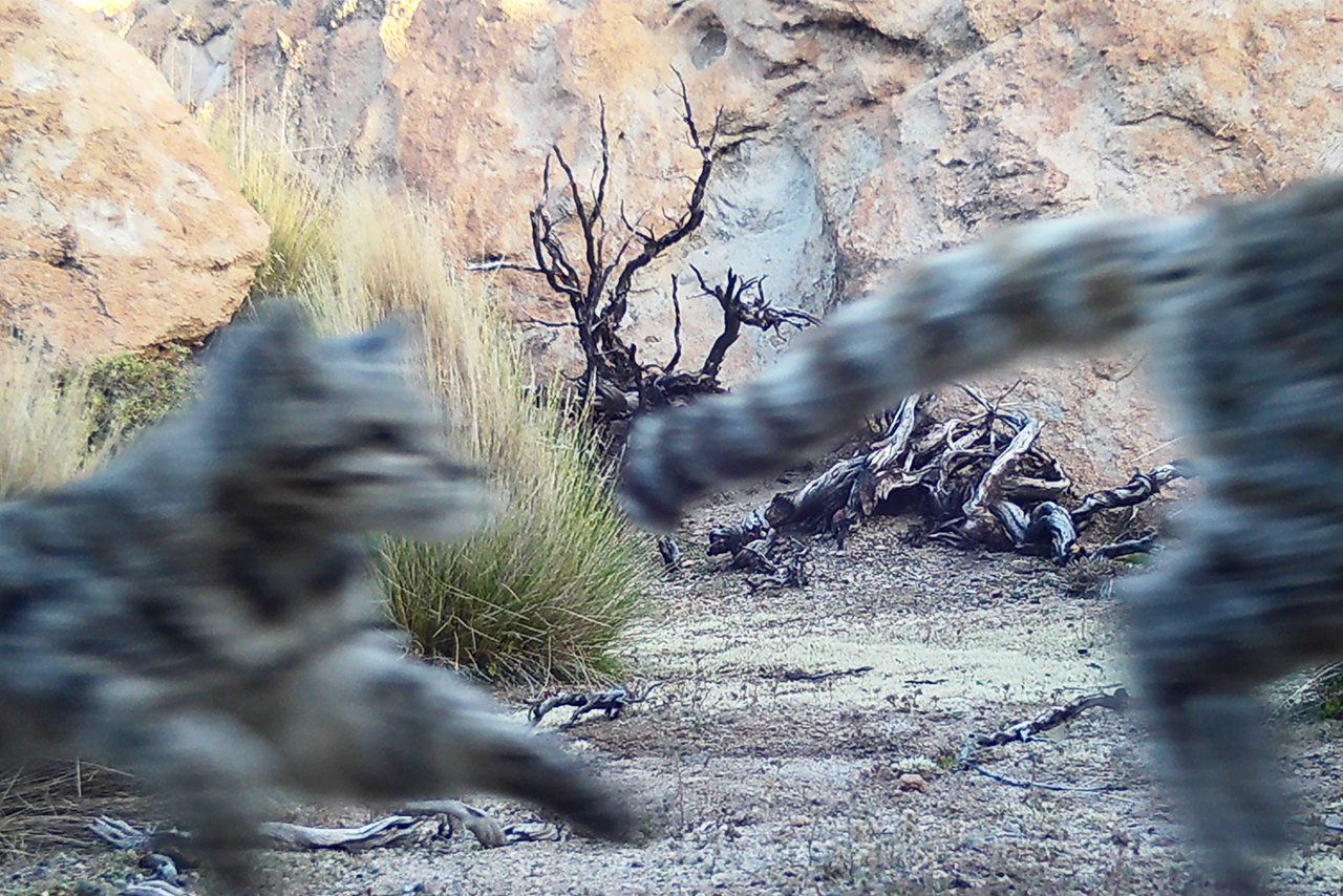 Una madre de gato andino y su cría avanzan juntas en los Andes. Cuidar la coexistencia en estos paisajes es también proteger la posibilidad de que nuevas generaciones, humanas y silvestres, continúen compartiendo las montañas. © AGA