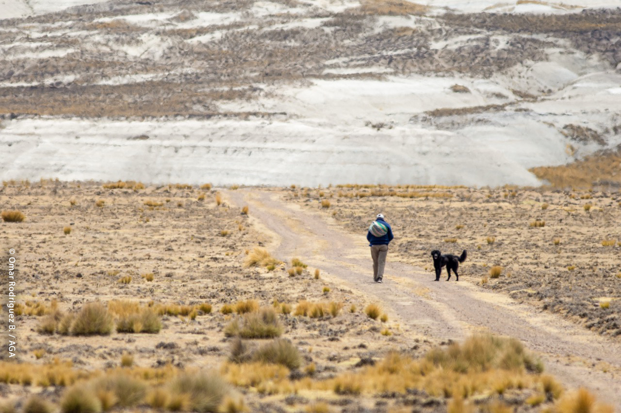 Un poblador y su perro atraviesan un paisaje andino compartido, donde la coexistencia entre personas, animales domésticos y fauna silvestre forma parte de la vida diaria. ©Omar Rodriguez B. / AGA